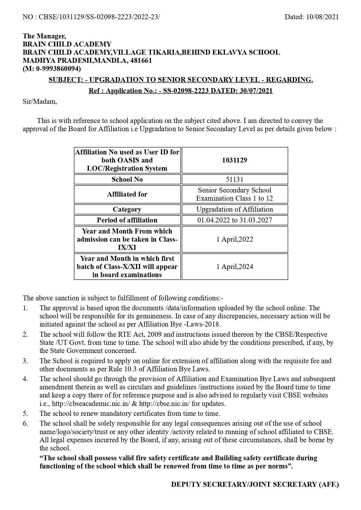 Brain Child Academy (School) is CBSE Affiliated School and also recognized by M.P.B.S.E. Affiliation documents are as follows: